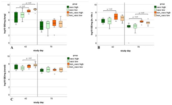 Viral load in tissue samples. Boxplots show 25th and 75th percentiles and median values, and whiskers show minimum and maximum values within 1.5 × interquartile range (IQR). Outliers are values with more than 1.5 × IQR (indicated using circles °), and extreme values are values with more than 3 × IQR (indicated using asterisks *). (A): Viral load in lung tissue (log10 GE/mg) from piglets necropsied on either study day 42 (first necropsy time point) or study day 70 (second necropsy time point) in each infected treatment group (vacc high: vaccinated, high dose [105 TCID50 /dose] infected; vacc low: vaccinated, low dose [103 TCID50/dose] infected; non-vacc high: non-vaccinated, high dose infected; non-vacc low: non-vaccinated, low dose infected). Significant differences (p < 0.05) between vaccinated and non-vaccinated groups are indicated. (B): Viral load in tracheobronchial lymph node (log10 GE/mg) from piglets necropsied on either study day 42 (first necropsy time point) or study day 70 (second necropsy time point) in each treatment group. Significant differences (p < 0.05) between vaccinated and non-vaccinated piglets are indicated. (C): Viral load in tonsils (log10 GE/mg) from piglets necropsied on either study day 42 (first necropsy time point) or study day 70 (second necropsy time point) in each treatment group. Significant differences (p < 0.05) between vaccinated and non-vaccinated piglets are indicated.