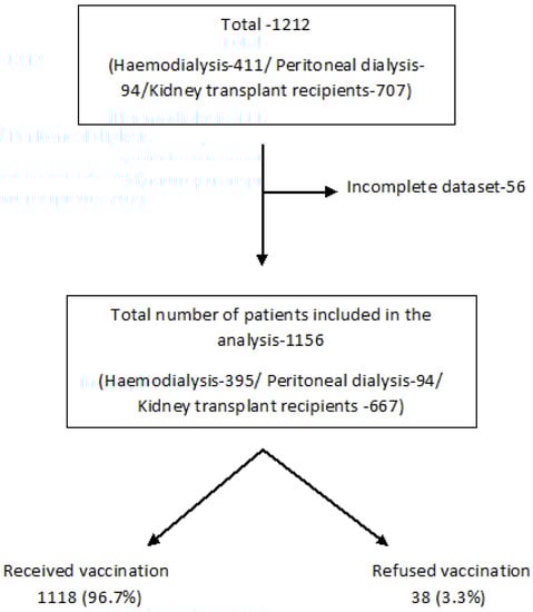 The following limitations of our study should be considered: We did not have access to vaccination uptake RRT data from other centres with different vaccination strategies, and it is unknown if these patients may have exhibited different hesitancy behaviour compared to the wider population of clinically extremely vulnerable patients. However, a preprint version of a study in 4697 dialysis patients from the US with 23.4% Black participants, representative of the US dialysis population, showed only a 76% COVID-19 vaccine uptake by September 2021 for at least one dose of a COVID-19 vaccine []. Finally, our access to the Greater Manchester clinically extremely vulnerable adult population was limited to aggregate data, and we could not perform statistical comparisons with our patients.