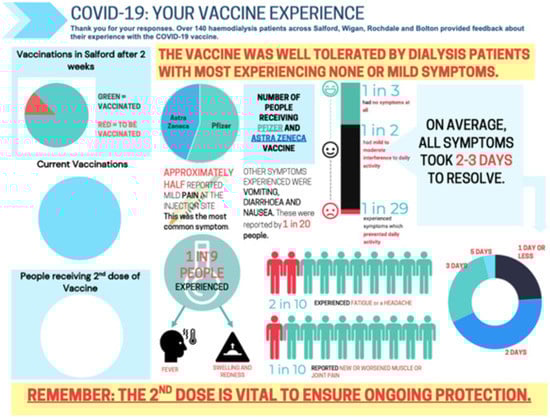 Local and regional patient representatives were involved in the vaccination workstream at regular online meetings, provided feedback, and shared emerging evidence using social media platforms and patient to patient discussions. Ethnic minority patient groups were specifically targeted. Presentations were organised for the Greater Manchester Kidney Information Network (https://kinet.site/gmkin/, accessed on 15 April 2022) and the African–Caribbean community initiative for kidney patients WSH BME Network (https://www.wshbmenetwork.org.uk/, accessed on 15 April 2022).