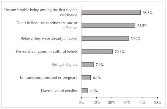 Among those with no vaccine intentions, the most common barriers to getting vaccinated were not believing that the vaccines were safe and effective (35.5%), not believing that they needed the vaccine because they had a previous COVID-19 infection (30.9%), and not being comfortable being among the first people vaccinated (38.8% (Figure 1)). Having a fear of needles was the least common barrier, with only 4.0% of participants indicating that choice.