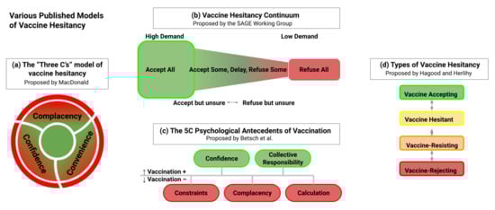 A compilation of the various models proposed to describe vaccine hesitancy. (a) The “Three C’s” model of vaccine hesitancy proposed by Macdonald, (b) “Vaccine Hesitancy Continuum” proposed by Sage Working Group, (c) “The 5C Psychological Antecedents of Vaccination” proposed by Betch et al., and (d) “Types of Vaccine Hesitancy” proposed by Hagood and Herlihy.