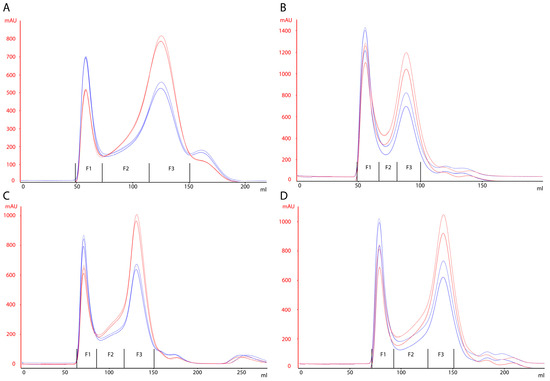 Size-Exclusion Chromatography (SEC) was performed in separation mode (separation of the desired sample from the retained molecules by the resin pores). Columns packed with the following resins were tested: WorkBeads 40/100, 40/1000, and 40/10,000, and Seplife 6 FF; the characteristics of the resins are summarized in Table 1. Three rounds of purification were carried out for each resin, and three fractions (F1, F2, and F3) were collected on each round. Fractions F1 and F3 correspond to the peaks on the chromatograms, and F2 is the plateau between the peaks. For all chromatographic runs, the same virus concentrate was used. The concentrates were loaded onto columns at a 10% column volume (CV), as recommended by the manufacturers. The absorption of UV at 280 (red line) and 260 (blue line) nm was recorded continuously during purification. The chromatograms are shown in Figure 1. The obtained eluates were analyzed for the content of total protein, bovine serum albumin (BSA), residual cellular DNA, and specific viral antigen (Table 2).