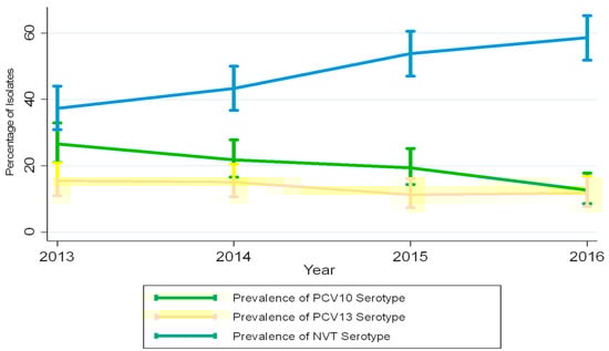 Proportion of children carrying PCV10, PCV13, and NVT serotypes over time. Rates for 2013 are from a previously published survey in the same community by the same group of authors.