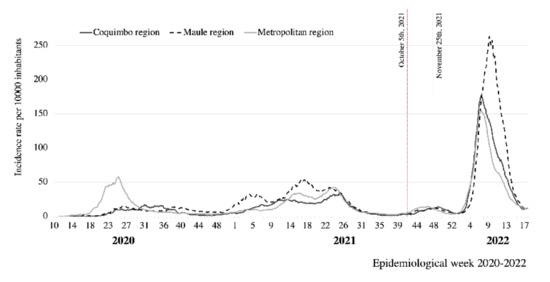 COVID-19 epidemic curve in three regions of Chile, 2020–2022. Source: [10].