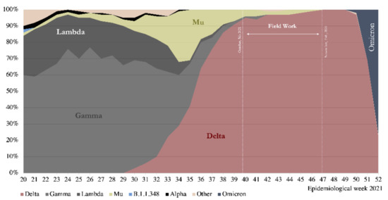 - Ministerio de Salud. Variantes SARS-CoV-2. 2021. Available online: https://vigilancia.ispch.gob.cl/app/varcovid (accessed on 4 January 2022).