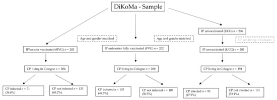 Data were collected from 17 December 2021 to 6 January 2022—a period during which the Omicron variant is assumed to have been the most prevalent strain (between approximately 20% in calendar week 50/2021 up to approximately 80% in calendar week 1/2022 [13]). In this period, we identified 206 unvaccinated infected persons ≥ 18 years of age within the DiKoMa registry (Figure 1; [14]). Four of them were excluded who only had contacts outside of Cologne, our area of responsibility. Each patient in the UCG was randomly matched 1:1 by age and sex with a booster-vaccinated SARS-CoV2-positive patient (booster-vaccinated group [BVG]; n = 202) and fully vaccinated, not boosted SARS-CoV2-positive patient (unboosted, fully vaccinated group [FVG]; n = 202).