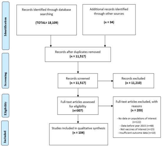 A total of 18,109 search results were identified from four databases and 34 from reference lists, grey literature and preprints (Figure 1). After removing duplicates, titles and abstracts, 11,519 studies were screened, and 307 studies were identified as eligible for full-text review. A total of 203 studies that had no information on the populations of interest, did not report relevant vaccines or included only information before 2015 were excluded. Finally, 104 publications were included in this review, and this included 19 studies on COVID-19 vaccine uptake. Most of the studies were cross-sectional, and the general quality range was low to medium (low-quality, 44 studies; medium-quality, 36 studies; and high-quality, 24 studies). The main differences between the study quality levels were related to vaccination exposure criteria (e.g., self-reported, laboratory testing) and depth of statistical analysis, e.g., most high-quality studies conducted an appropriate statistical analysis that included accounting for confounding factors such as age, gender and country of origin. The quality assessment showed an overview of the methodological process in the included studies and was not used to interpret the finding so as not to limit the interpretation of the information provided.