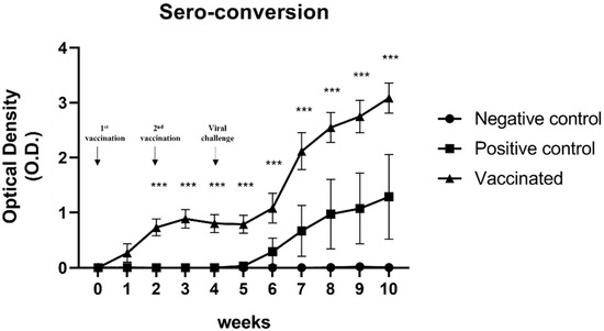 Fecal and serum samples were collected from all pigs weekly for 10 weeks after vaccination. Fecal samples were suspended in PBS (1:10) and centrifuged at 3000× g for 30 min, and the supernatants were collected. Blood samples were collected using a Vacutainer®® (BD Biosciences, San Jose, CA, USA) and centrifuged at 3000× g for 20 min to obtain sera. All fecal and serum samples were stored at −70 °C until use. Viral RNA was extracted from 150 μL of serum or fecal samples using the Patho Gene-spin DNA/RNA kit, according to the manufacturer’s instructions (Intron, Gyeonggi-do, Korea). RNA samples were stored at −70 °C.