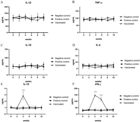 The serum levels of IL-12 and IFN-γ, representing Th1 immune responses, IL-4 and IL-10, representing Th2 immune responses, and IL-1β and TNF-α, representing pro-inflammatory cytokines were measured at 0, 2, 4, 6, 8, and 10 weeks. The levels of cytokines for the Th2 immune response and those of pro-inflammatory cytokines in the serum samples from vaccinated and positive control pigs were not significantly changed compared to those from negative control pigs (Figure 2A–D). However, the serum levels of IL-12 and IFN-γ, which represent Th1 immune responses in vaccinated pigs, were significantly elevated compared with those in negative and positive control pigs (p < 0.001) (Figure 2E,F). A statistically significant increase in the serum levels of IL-12 was observed 2 weeks after the second vaccination. Elevation of IFN-γ levels in serum samples was observed 2 weeks after the second vaccination. Furthermore, a significant increase was confirmed compared to that in the negative and positive control groups at 4 weeks after the second vaccination, although there was a slight decrease compared to that observed at 2 weeks after the second vaccination (Figure 2E,F).