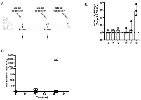 New Zealand rabbits (n = 3) were immunized with two subcutaneous inoculations of SARS-CoV-2 S-RBD MAPS vaccine at Day 0 and 21 (Figure 2A). The antibody responses against SARS-CoV-2 S protein were measured on Day 0 (baseline before injection, P0), Day 21 (representing the response after the first immunization, P1), and again on Day 42 (representing the response after the second immunization, P2) by ELISA and virus neutralization assay (VNT). We noted an increase in serum concentration of antibodies to S and neutralizing antibody activity, especially after the second dose (Figure 2B,C).