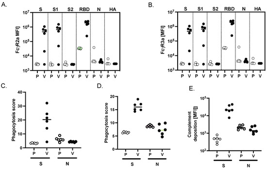 Finally, to explore the functional impact of vaccine-induced antibody Fc profiles, we examined cellular monocyte phagocytosis (ADCP, Figure 4C), neutrophil phagocytosis (ADNP, Figure 4D), and complement deposition (ADCD, Figure 4E). All these effector functions were observed in sera obtained from SARS-CoV-2-immunized NHP in the presence of the S protein; as expected, none of these activities was seen in the presence of the N protein.