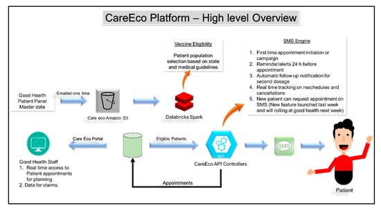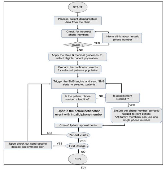 A framework that proved helpful for achieving success in our vaccination effort is the “C.D.S. Five Rights” approach. A GHAC physician with a clinical informatics background collaborated with CEC to develop a self-scheduling (registration and scheduling appointment) web-based mobile application that integrated with our ECW scheduling application. The architecture of this software for the flow of information is detailed in Figure 1a,b.