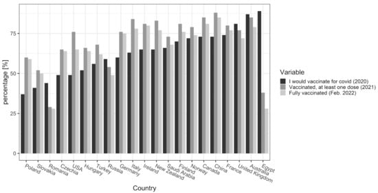 For context, we also compared the quantitative data on COVID-19 vaccination willingness expressed in 2020 in various countries based on the previously published data [9], with the current vaccination levels in the same countries based on the data available in February 2022 [4] to determine whether the vaccination coverage corresponds with previous declarations on a general level.