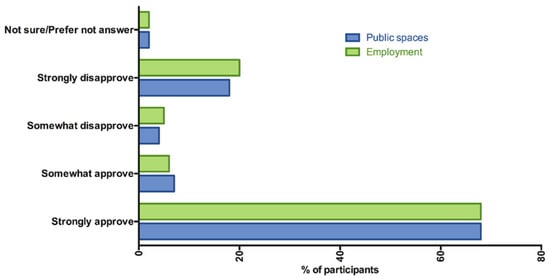 Attitudes to adult vaccine mandates. Study participants were asked: “Do you approve of the government requiring COVID-19 vaccine to get on public transportation?” or “Do you approve employers requiring a COVID-19 vaccine to get a job or certain pay allowances?”.