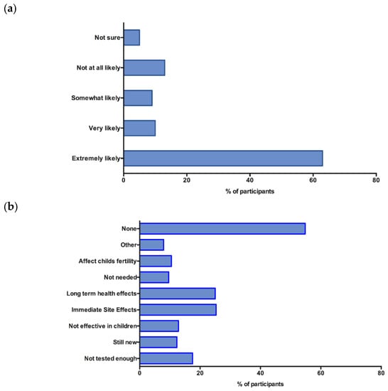 Attitudes towards COVID-19 vaccines for children. (a) Likelihood of vaccinating children. Participants were asked “If the COVID-19 vaccine was available to your child, how likely would you be to get your child vaccinated” (b) Concerns about vaccines for children, participants were asked “What concerns about COVID-19 vaccines for do you have, if any?”.