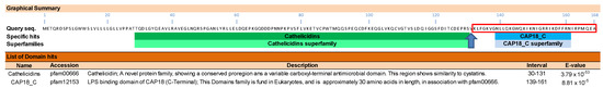 The amino acid sequences were verified as belonging to the cathelicidin family by identifying the cathelin conserved domain with the NCBI “Identify Conserved Domains with CD-search” tool [14]. This server uses “reverse position-specific BLAST” to compare a query protein sequence against conserved domain models collected from a number of source databases, and presents the results as a concise display. If CD-Search finds a specific hit, there is high confidence in the association between the protein query sequence and a conserved domain, also resulting in a high confidence level for the inferred function of the protein query sequence.