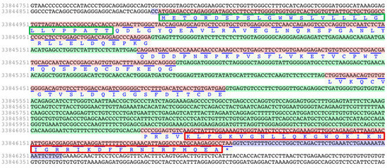 Nucleotide and amino acid sequence of the gene coding for the X1 variant of the Iberian mole (Talpa accidentalis). The nucleotide sequence of the introns is shaded in green and the exons are in red. The translated sequence of the exons is in blue. The mRNA ends of the transcript variant X1 (1375 bp) is shaded in purple. The elastase cleaving site was predicted for the first valine or alanine of the amino acid sequence from the fourth exon. The sequence of the signal peptide is within the green box. The sequence of the antimicrobial portion of the putative peptide for the cathelicidin of Talpa occidentalis is within the red box. The figure was a capture of the NCBI Genome Data Viewer using the tool “Sequence text view”.