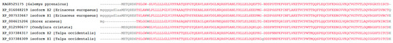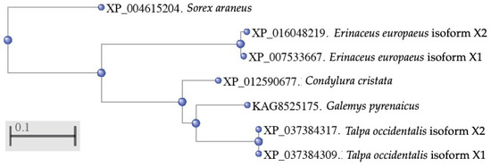 In order to study the evolutionary relationship of Eulipotyphla cathelicidins comprising exon 1-3, we next constructed a phylogenetic tree of the aligned sequences using the COBALT tree tool of the NCBI. We observed that the Eulipotyphla sequences formed distinct groups. The bottom cluster of the tree comprised the sequences of the two isoforms identified in the Iberian mole (Talpa occidentalis). These two sequences were in close proximity with the sequence of the Iberian desman (Galemys pyrenaucus), which, together with the sequence of the star-nosed mole (Condylura cristata), formed a separate cluster. The two sequences of the European hedgehog (Erinaceus europaeus) corresponding to the cathelicidin isoforms X1 and X2 formed a distinct cluster. Finally, the cathelicidin sequence of the common shrew (Solex araneus), formed a separated branch, suggesting that this cathelicidin gene could have originated from a common ancestor (Figure 4).