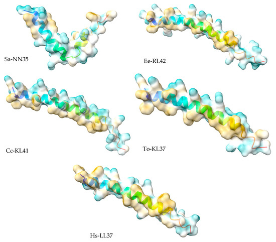 We next modelled the putative Eulipotyphla peptides in order to elucidate their secondary and tertiary structures. This will help us to investigate the potential for interaction with the biological membranes and other structural features that contribute to the antimicrobial activity. For comparison with the physicochemical properties of a well-known cathelicidin, we also modelled the human cathelicidin Hs-LL37 (LLGDFFRKSKEKIGKEFKRIVQRIKDFLRNLVPRTES) and used it for structural studies as a peptide of reference for cathelicidin-derived AMPs (Figure 5). In the same way, all predicted peptides of this order, except Sa-NN35, had a CAP18 region (pfam12153, Table 1).