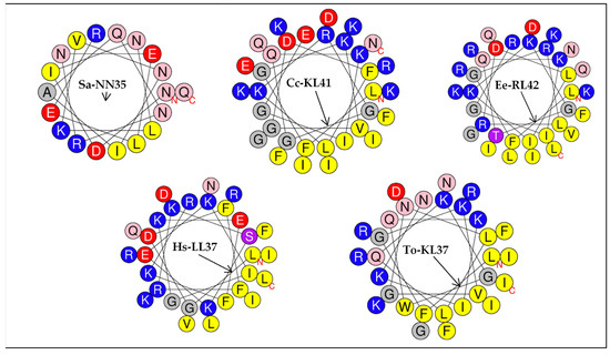 Helical wheel analysis showed that putative sequences derived from Eulipotyphla cathelicidins formed distinct amphipathic structures and all showed a hydrophobic face with hydrophilic residues facing upward. According to this computation, with the exception of Sa-NN35, all alpha-helices were hydrophobic, with values between 0.174 (of Hs-LL37) and 0.338 (of To-KL37) and cationic, with a net positive charge between 5 (of Cc-KL41) to 9 (of Ee-RL42). The hydrophobic face of the common shrew Sa-NN35 (LLI) was the shortest of all Eulipotyphla helices. In contrast, the helix of the Iberian mole (To-KL37) showed the longest hydrophobic face (LIGIVIILFFGW) of all peptides studied. The lowest value for the hydrophobic moment (0.148) corresponded to the helix of the common shrew (Solex araneus) Sa-NN35.