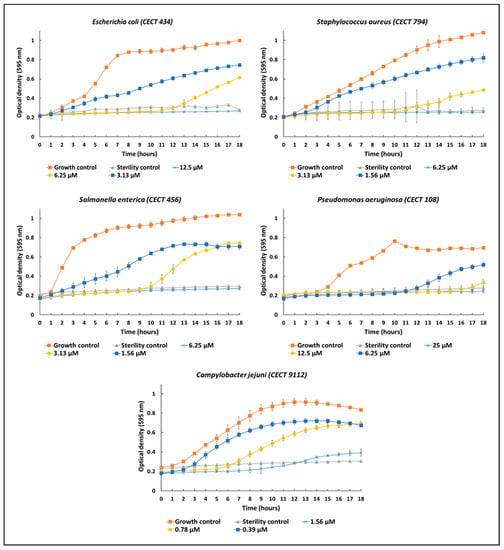 In vitro test for the detection of the growth of microorganisms after 18 h in the presence of the synthetic peptide at its higher value of the MIC concentration obtained for the microorganisms Escherichia coli (CECT 434), Staphylococcus aureus (CECT 794), Salmonella enterica (CECT 456), Pseudomonas aeruginosa (CECT 108), and Campylobacter jejuni (CECT 9112).