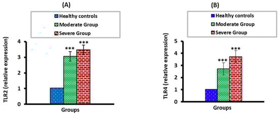 The mRNA expression levels of TLR2 (A) and TLR4 (B) in moderate and severe COVID-19 groups compared to healthy control. *** p < 0.001.
