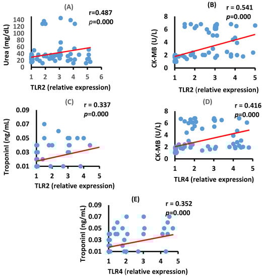 Correlation between kidney and heart function biomarkers in serum and TLR2 and TLR4 mRNA expression in moderate COVID-19 patients. Correlation between urea and TLR2 (A), p = 0.000, CK-MB and TLR2 (B), p = 0.000, Troponin I and TRL2 (C), p = 0.000, CK-MB and TLR4 (D), p = 0.000) and between Troponin I and TLR4 (E), p = 0.000.