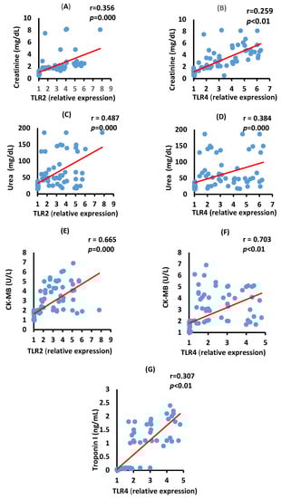 Correlation between kidney and heart function biomarkers in serum and TLR2 and TLR4 mRNA expressions in severe COVID-19 patients. Correlations between creatinine with TLR2 (A), p = 0.000), creatinine with TLR4 (B), p < 0.01), urea with TLR2 ((C), p = 0.000), urea with TLR4 ((D), p = 0.000), CK-MB with TLR2 (E), p = 0.000), TLR4 (F), p < 0.01), and Troponin I level with TLR4 (G), p < 0.01).