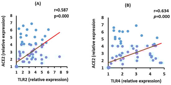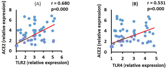 Correlations between ACE2 mRNA expression with TLR2 (A) (p = 0.000), and TLR4 (B) (p = 0.000) mRNA expression in severe COVID-19 patients.