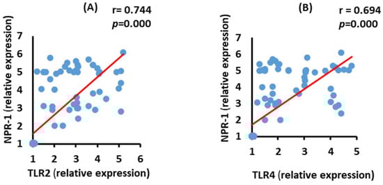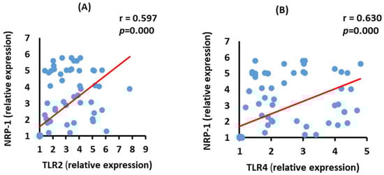 Correlations between NRP-1 mRNA expression with TLR2 (A) (p = 0.000) and TLR4 (B) (p = 0.000) mRNA expression in severe COVID-19 patients.
