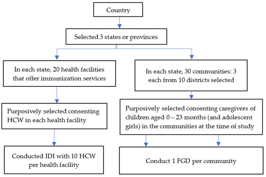 The participants in the IDIs came from 20 health facilities that offer immunization services in 10 purposively selected LGAs per state. A maximum of 10 consenting HCWs were interviewed in each health facility, and in those who did not have 10 HCWs, all eligible HCWs were interviewed. Overall, a total of 517 HCWs were interviewed. At least 6 consenting caregivers of children aged 0–23 months or adolescent girls participated in the FGDs in 10 communities per state, resulting in a total of 180 participants from 30 communities. The samples were purposively guided to keep the focus on the characteristics of the populations that were of interest to the study.