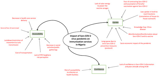 This study assessed immunization service uptake and the effects of policy strategies and measures taken to prevent community transmission in the context of the COVID-19 pandemic in Nigeria. Three significant factors were affected, i.e., accessibility to immunization service, a significant reduction in immunization demand and uptake among caregivers, and a lack of trust by caregivers and HCWs (Figure 2).