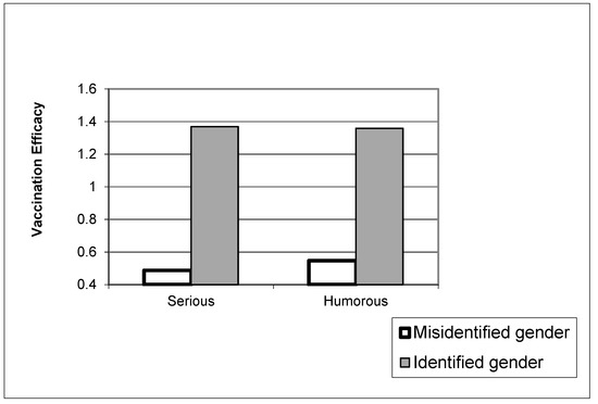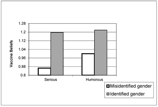 Prior vaccination status was not associated with beliefs about vaccination, but pre-exposure belief was a significant predictor of post-exposure belief (β = 0.69, p < 0.001). Age (β = 0.06, p < 0.001) and education (β = 0.06, p < 0.001) were positively associated with beliefs about vaccination. Among the manipulation check variables, only the ability to identify the protagonist’s gender was positively associated with more positive beliefs about vaccination (β = 0.07, p < 0.001). None of the three manipulations predicted vaccination beliefs. However, a significant interaction effect was observed between the gender manipulation check and exposure to the humor video (β = −0.18, p < 0.001), and the pattern of the interaction is shown in Figure 3. As in the previous case, the ability to correctly identify the protagonist gender resulted in more positive beliefs about vaccination. Among those less able to identify the protagonist’s gender, those who saw the humor video had more positive beliefs in vaccination than those who saw the serious video.