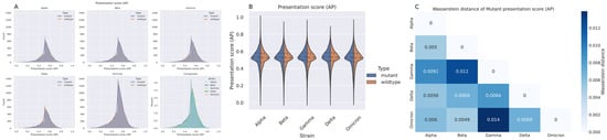 Comparisons of the distribution of antigen presentation (AP) scores for each SARS-COV-2 variant of concern (VOC) for the mutated and corresponding wildtype peptides. The AP scores have been filtered such that only peptides with AP scores >0.5 in either the mutant or corresponding wildtype are shown. (A) Histogram with a kernel density estimate of the distribution of AP scores for the mutant and wildtype peptides for each VOC. The subfigure “Comparison” shows the percentage of AP scores in each bin for all VOCs. (B) Violin plots of the AP score distribution between mutant and wildtype peptides for each VOC. The dashed lines within each violin plot represent quartiles. (C) The pairwise Wasserstein distance between the distribution of AP scores for the mutated peptides in the VOCs.
