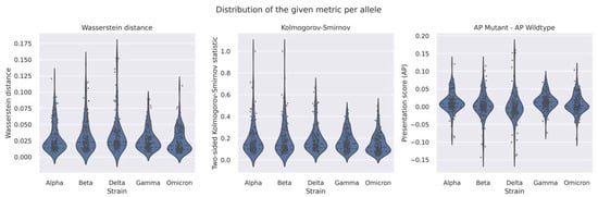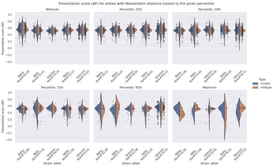 Figure 3 shows the distribution of AP scores for mutant and wildtype epitopes for a selected group of HLA alleles. Each plot in the figure corresponds to either the minimum, maximum, or a specific percentile. For each VOC, we selected HLA alleles such that their Wasserstein distance, between mutant and wildtype is the closest to the minimum, maximum, or the given percentile. For instance, for “Percentile: 25th”, the HLA alleles shown are the ones for which the Wasserstein distance is the closest to where 25% of the data lives with respect to the Wasserstein distance metric. This analysis serves as a guide to establish a connection between the AP score distributions and the Wasserstein distance by showing representative samples for the AP score distributions between mutant and wildtype epitopes. A more detailed figure with all HLA alleles can be found in Supplementary File S2 (S2-Figure S3).