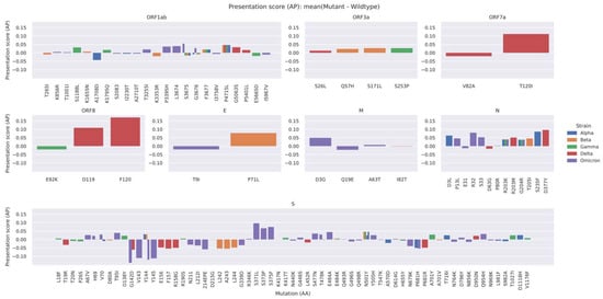 Average difference in AP score (mutant–wildtype) for each mutation in the VOC, denoted by the different colors. Each plot corresponds to a protein of the virus in which mutations occurred.