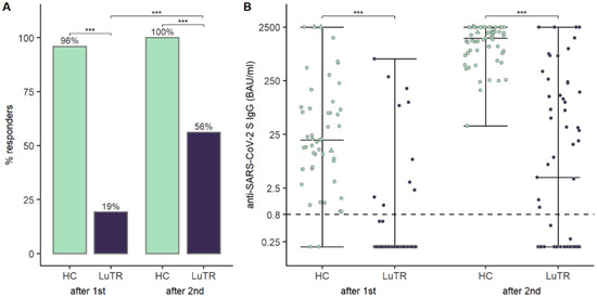 Humoral response after mRNA vaccine in LuTRs and in HCs after the first and second immunization: seroconversion rates of SARS-CoV-2 antibodies and increase in seroconversion rate (% of response) (A). SARS-CoV-2 S antibody levels (BAU/mL). Upper level of quantification: 2500 BAU/mL. The horizontal line indicates the cutoff for seroconversion. Circles represent individual antibody levels. Participants with a history of COVID-19, prior to immunization, are represented as triangles (B). (*** significant).