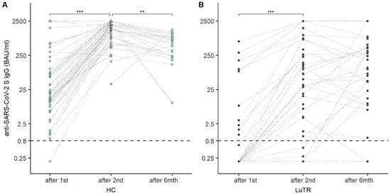 Change in SARS-CoV-2 S antibody levels (BAU/mL) over time in HCs (A) and LuTRs (B). Upper level of quantification: 2500 BAU/mL. The horizontal line indicates the cutoff for seroconversion. Circles represent individual antibody levels. Participants with a history of COVID-19, prior to immunization, are presented as triangles. Darker lines indicate overlapping points. (**, *** significant).
