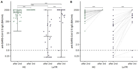 Humoral response in LuTRs and in HCs 4 weeks after the second and the third dose of vaccination: SARS-CoV-2 S antibody levels (BAU/mL) (A), and change in SARS-CoV-2 S antibody levels (BAU/mL) after second and third immunization (B). The horizontal lines indicate the cutoff for seroconversion. Circles represent individual antibody titers. Participants with a history of COVID-19, prior to immunization, are presented as triangles. Darker lines indicate overlapping points. (*** significant).