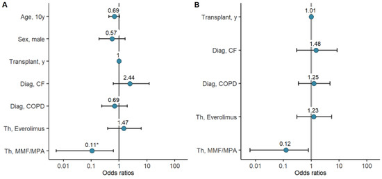 Logistic regression assessing seroconversion in LuTRs: univariate logistic regression including age, sex, years since lung transplantation, diagnosis, immunosuppressive therapy (A). Multivariate logistic regression for years since lung transplantation, diagnosis, and immunosuppressive therapy, adjusted for age and sex (B). (* significant).