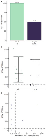 To assess if SARS-CoV-2 vaccination generated T cell responses, PBMCs collected 1–2 weeks after the second vaccine dose were analyzed using IFN-γ ELISpot assays. T cell responses were induced in 50% (8/16) of LuTRs and 100% (16/16) of HCs. No significant differences in median age in LuTRs with T cells responses (51, 23–64) and without T cell responses (58, 39–71), p = 0.24 were detected. Of the eight LuTRs with detectable T cell responses, three (38%) developed humoral responses, whereas five (62%) did not seroconvert after the second vaccination (Figure 5).