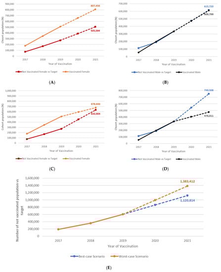 Unvaccinated population according to two scenarios vs. NIP optimal target. (A) Pandemic ‘best case scenario’ for coverage rates between 2020 and 2021, female; (B) Pandemic ‘best case scenario’ for coverage rates between 2020 and 2021, male; (C) Pandemic ‘worst case scenario’ for coverage rates between 2020 and 2021, female; (D) Pandemic ‘worst case scenario’ for coverage rates between 2020 and 2021, male; (E) Unvaccinated population according to two scenarios vs. NIP optimal target.