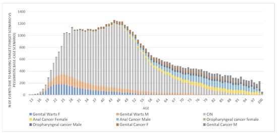 Figure 2 shows the forecasted number of events, by HPV-related conditions, attributed to the suboptimal VCRs vs. the NIP’s immunization targets over the years (age of the population is considered). The model estimates that over 1200 events annually could be averted if the target for vaccination was reached. GWs and CIN cases represent the most common events in the younger ages of the population, while cancers are the most frequent, though less incident, in the older ages.