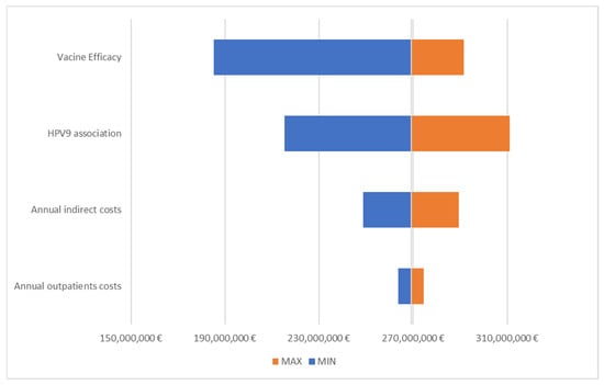 Figure 3 shows that the model was sensitive to the vaccine efficacy and association of HPV9 diseases. In all tested scenarios, the incremental savings at the target VCRs was between EUR 185 (−31% vs. the base case analysis) and EUR 311 (+16% vs. the base-case analysis) million.