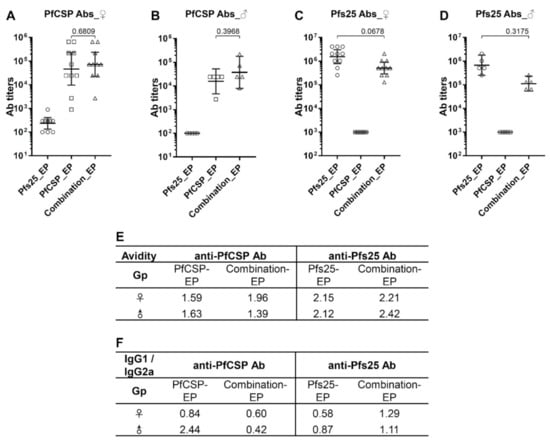 For Pfs25-specific antibody response, after 3-dose DNA immunization, all female Balb/c mice in Pfs25-EP and combination-EP groups exhibited anti-Pfs25 antibodies (Figure 2C). The average antibody titer in the Pfs25-EP group was a little higher than that of the combination-EP group, but the difference was not statistically significant (GM, Pfs25-EP: 2,262,742 vs. combination-EP: 1,212,573, p = 0.0678) (Figure 2C). We also observed a similar pattern of antibody levels in male Balb/c mice between the Pfs25-EP and combination-EP groups (GM, Pfs25-EP: 1,392,881 vs. combination-EP: 527,803, p = 0.3175) (Figure 2D). Similarly to results for PfCSP-specific antibodies, immunization with DNA combination did not compromise the immunogenicity of the Pfs25 DNA vaccine. No anti-Pfs25 response was detected in both female and male Balb/c mice in the PfCSP-EP groups that served as the negative control for anti-Pfs25 response (titers < 1000). Pfs25-specific antibody titers in male mice were lower than those in female mice; however, the differences between male and female mice were not statistically significant (Pfs25-EP, female: 2,262,742 vs. male: 1,392,881, p = 0.6154; combination-EP, female: 1,212,573 vs. male: 527,803, p = 0.0979) (Figure 2C,D).