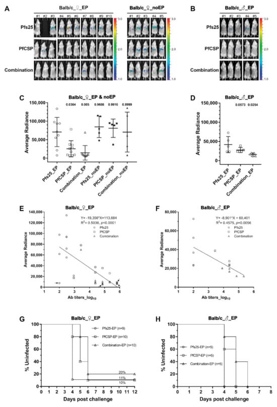 Protection against sporozoite challenge. Balb/c mice immunized with single and combined DNA vaccines were challenged by intravenous injection of 2000 sporozoites (PbPfCSP-GFP/Luc) per mouse 2 weeks after the third immunization. At 40–42 h after challenge, mice were injected intraperitoneally with D-Luciferin and imaged using IVIS. (A,B) Images of in vivo bioluminescence in mouse livers. Rainbow scales are expressed in radiance flux (×105 p/sec/cm2/sr). (A) Female mice in groups 1–6, immunized with or without EP. (B) Male mice in groups 7–9, immunized with EP. (C,D) Quantification of total flux from female mice (shown in (A)) and male mice (shown in (B)), respectively. Bars indicate the arithmetic mean and SD, and each symbol represents an individual mouse. Statistical differences between the control group (Pfs25-EP) and all other groups were evaluated by one-way ANOVA and Tukey’s multiple comparison test. p values are indicated on the top. (E,F) Correlations between PfCSP-specific antibody ELISA titers and liver-stage parasite loads (bioluminescence) for female mice in groups 1–3 (E) and male mice in groups 7–9 (F), respectively. Each symbol represents an individual mouse. Four mice with no detectable parasite 14 days after challenge are indicated by arrows in E, indicating full protection from challenge. Correlation was determined using a linear regression. Equations, R2 values and p values are shown. (G,H) Kaplan–Meier survival curves reporting percentage of parasite-free mice after challenge. (G) Female mice in groups 1–3. (H) Male mice in groups 7–9. Mice were monitored for blood-stage parasitemia by Giemsa-stained thin blood smears each day post challenge. Sterile protection was defined as mice without detectable parasitemia in the blood during the 14-day follow-up.