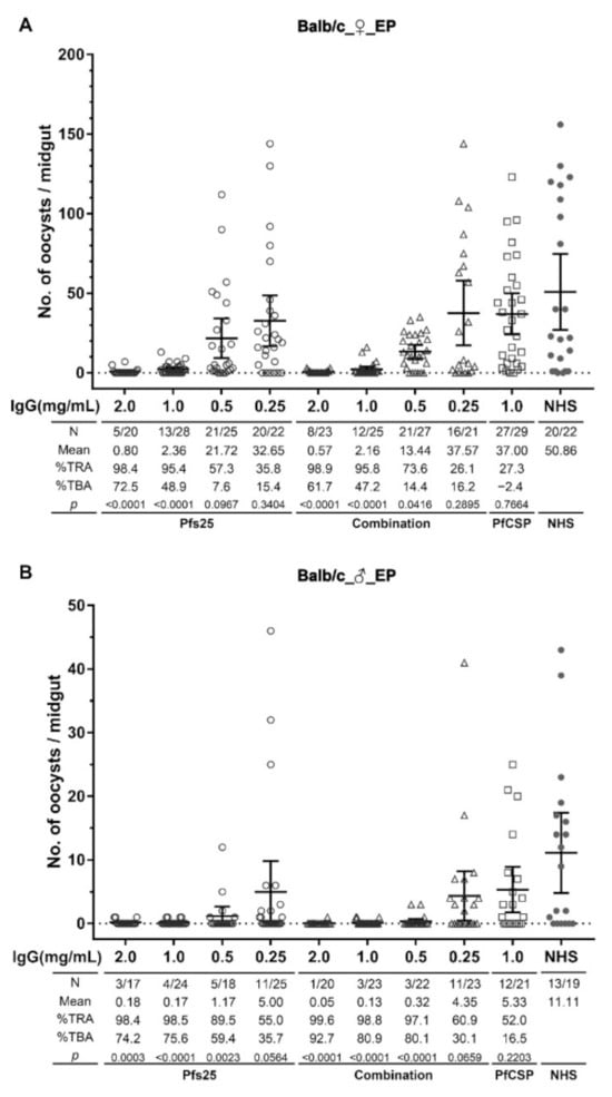Total IgGs were purified using Protein G-Sepharose beads (Invitrogen, Waltham, MA, USA) from pooled sera of immune groups at final bleeds as described previously [,]. All purified IgGs were concentrated using Amicon ultra centrifugal filters (MilliporeSigma, Burlington, MA, USA) and adjusted to 8 mg/mL, then stored frozen in PBS. IgGs from Pfs25-EP and combination-EP groups were tested in SMFAs at final concentrations of 2, 1, 0.5 and 0.25 mg/mL. IgGs from the PfCSP-EP group at a final concentration of 1 mg/mL and normal human serum (NHS) were used as negative controls. For SMFA, purified IgGs were serially diluted using NHS and combined with human RBC and P. falciparum NF54 gametocytes to 50% hematocrit and 0.2 to 0.3% gametocytemia, respectively. Anopheles stephensi mosquitoes (4–5 days old) starved for 6–7 h were fed using water jacketed glass feeders maintained at 37 °C for 15 min. The unfed mosquitoes were removed, and blood-fed mosquitoes were maintained for 8–10 days in the insectary (27 °C, 70–80% RH). Individual mosquito midguts were dissected and stained with 0.5% mercurochrome to determine oocyst number. Mosquito infectivity was measured by comparing oocyst burden as well as the prevalence of infected mosquitoes. Transmission reduction activity (TRA) is defined as the percentage reduction in the number of oocysts, which is calculated using the formula: percentage oocyst reduction = [1 − (mean number of oocysts in test IgG/mean number of oocysts in negative control)] × 100. Transmission blocking activity (TBA) is defined as the percentage reduction in infection prevalence, which is calculated using the formula: percentage prevalence reduction = [1 − (prevalence of infected mosquitoes in test IgG/prevalence of infected mosquitoes in negative control)] × 100.