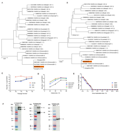 Characterization of the Omicron vaccine candidate. (A,B) SARS-CoV-2 maximum likelihood phylogenetic tree. (C) Growth kinetic analysis of 3 Omicron strains. (D) The effect of inoculation MOI on HK-OM-P7 stock virus titer. (E) Inactivation kinetics of three batches of virus supernatant. (F) The protein composition of Omicron vaccine (Vero cell) was evaluated by incubating with antibodies targeting S1 protein, S2 protein, and N protein.