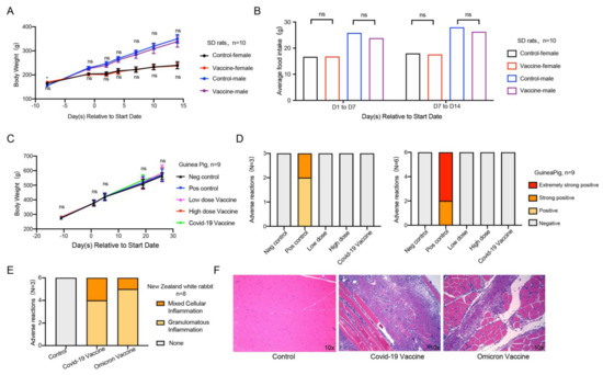 To evaluate the safety of the Omicron vaccine, we performed acute toxicity, systemic anaphylaxis, and muscle stimulation experiments. In the acute toxicity experiment, we randomly divided female and male SD rats into two groups with similar body weights. The negative control group was intramuscularly injected with sodium chloride solution, and the experimental group was intramuscularly injected with a middle (6 μg/dose) dose of inactivated vaccine. We observed and recorded adverse reactions regularly. The results appeared to show that no death or dying was found in each group of animals during the test, and no abnormal reaction was found in the clinical observation. Compared with the negative control group of the same gender, the weight (Figure 5A) and food intake (Figure 5B) of the animals in the experimental group were similar. The results of the anatomical observation of rats showed that there were no abnormal changes in the main organs and tissues in each group. The above results indicated that the Omicron vaccine did not induce acute toxicity in rats.