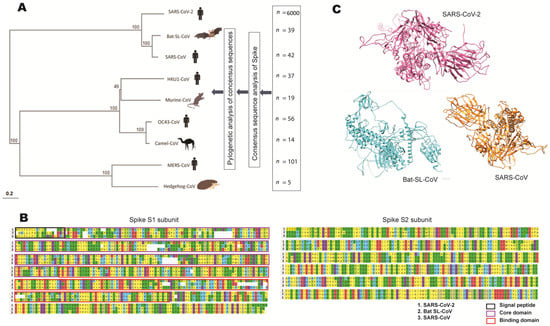 (A) The phylogenetic analysis of the spike consensus sequences of SARS-CoV-2 and other representatives of the genus Betacoronavirus. The consensus sequences were generated from genome sequences of SARS-CoV-2 (n = 6000), HKU1-CoV (n = 37), SARS-CoV (n = 42), MERS-CoV (n = 101), OC43-CoV (n = 56), bat-SL-CoV (n = 39), murine-CoV (n = 19), camel-CoV (n = 14), and hedgehog-CoV (n = 5) [,]. (B) A comparison of the protein sequences of the S1 and S2 subunits of the spike region with the consensus sequences of SARS-CoV-2, bat SL-CoV, and SARS-CoV. Analysis was performed and displayed using MEGAX. (C) Tertiary structures of the spike region based on the consensus sequences of SARS-CoV-2, bat SL-CoV, and SARS-CoV predicted by ITASSER. CoV: coronavirus; MERS: Middle East respiratory syndrome; SARS: severe acute respiratory syndrome; SL: SARS-like.